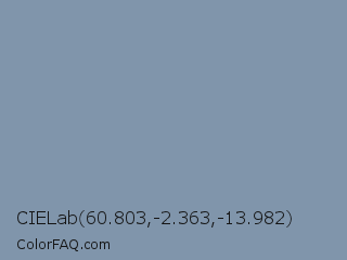 CIELab 60.803,-2.363,-13.982 Color is a normal blue color and the nearest color is Weldon Blue #7c98ab. Hex code #8095ab and RGB value is rgb(128,149,171). In RGB color space, this color is composed of 50% red, 58% green, 67% blue, In CMYK color space, this color is composed of 25% cyan, 13% magenta, 0% yellow , 33% black , In HSL color space, this color has a hue angle of 211° , 20% saturation and 59% lightness.