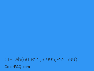 CIELab 60.811,3.995,-55.599 Color is a normal blue color and the nearest color is Brilliant Azure #3399ff. Hex code #3096f5 and RGB value is rgb(48,150,245). In RGB color space, this color is composed of 19% red, 59% green, 96% blue, In CMYK color space, this color is composed of 80% cyan, 39% magenta, 0% yellow , 4% black , In HSL color space, this color has a hue angle of 209° , 91% saturation and 57% lightness.
