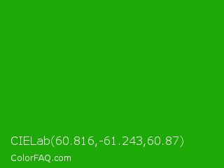 CIELab 60.816,-61.243,60.87 Color is a normal green color and the nearest color is Slimy Green #299617. Hex code #1eaa06 and RGB value is rgb(30,170,6). In RGB color space, this color is composed of 12% red, 67% green, 2% blue, In CMYK color space, this color is composed of 82% cyan, 0% magenta, 96% yellow , 33% black , In HSL color space, this color has a hue angle of 111° , 93% saturation and 35% lightness.