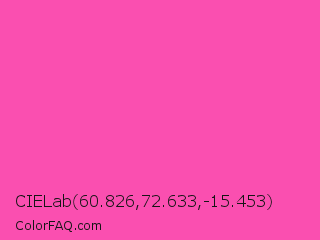 CIELab 60.826,72.633,-15.453 Color is a light magenta color and the nearest color is Brilliant Rose #f653a6. Hex code #fa4fb0 and RGB value is rgb(250,79,176). In RGB color space, this color is composed of 98% red, 31% green, 69% blue, In CMYK color space, this color is composed of 0% cyan, 68% magenta, 30% yellow , 2% black , In HSL color space, this color has a hue angle of 326° , 94% saturation and 65% lightness.