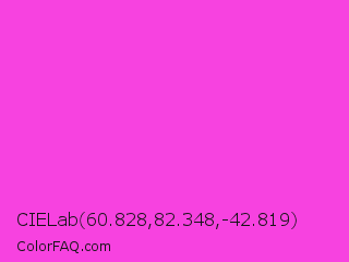 CIELab 60.828,82.348,-42.819 Color is a light magenta color and the nearest color is Purple Pizzazz #fe4eda. Hex code #f742e0 and RGB value is rgb(247,66,224). In RGB color space, this color is composed of 97% red, 26% green, 88% blue, In CMYK color space, this color is composed of 0% cyan, 73% magenta, 9% yellow , 3% black , In HSL color space, this color has a hue angle of 308° , 92% saturation and 61% lightness.