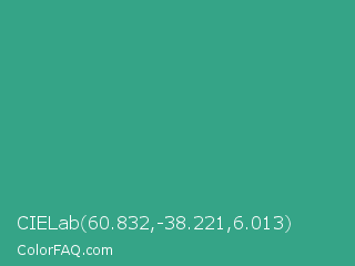 CIELab 60.832,-38.221,6.013 Color is a normal cyan color and the nearest color is Zomp #39a78e. Hex code #35a487 and RGB value is rgb(53,164,135). In RGB color space, this color is composed of 21% red, 64% green, 53% blue, In CMYK color space, this color is composed of 68% cyan, 0% magenta, 18% yellow , 36% black , In HSL color space, this color has a hue angle of 164° , 51% saturation and 43% lightness.