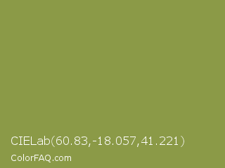 CIELab 60.83,-18.057,41.221 Color is a normal lime color and the nearest color is Sycamore #908d39. Hex code #8b9a47 and RGB value is rgb(139,154,71). In RGB color space, this color is composed of 55% red, 60% green, 28% blue, In CMYK color space, this color is composed of 10% cyan, 0% magenta, 54% yellow , 40% black , In HSL color space, this color has a hue angle of 71° , 37% saturation and 44% lightness.