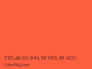 CIELab 60.844,58.683,48.423 Color is a light red color and the nearest color is Orange Soda #fa5b3d. Hex code #fc5e40 and RGB value is rgb(252,94,64). In RGB color space, this color is composed of 99% red, 37% green, 25% blue, In CMYK color space, this color is composed of 0% cyan, 63% magenta, 75% yellow , 1% black , In HSL color space, this color has a hue angle of 10° , 97% saturation and 62% lightness.