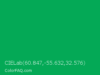 CIELab 60.847,-55.632,32.576 Color is a normal green color and the nearest color is Green Pigment #00a550. Hex code #04a956 and RGB value is rgb(4,169,86). In RGB color space, this color is composed of 2% red, 66% green, 34% blue, In CMYK color space, this color is composed of 98% cyan, 0% magenta, 49% yellow , 34% black , In HSL color space, this color has a hue angle of 150° , 95% saturation and 34% lightness.
