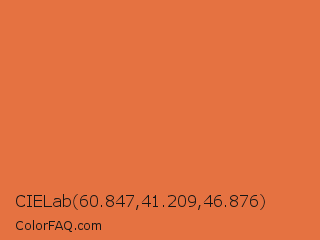 CIELab 60.847,41.209,46.876 Color is a normal orange color and the nearest color is Red Damask #da6a41. Hex code #e57241 and RGB value is rgb(229,114,65). In RGB color space, this color is composed of 90% red, 45% green, 25% blue, In CMYK color space, this color is composed of 0% cyan, 50% magenta, 72% yellow , 10% black , In HSL color space, this color has a hue angle of 18° , 76% saturation and 58% lightness.