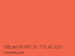 CIELab 60.857,51.775,42.223 Color is a light red color and the nearest color is Tomato #ff6347. Hex code #f2674b and RGB value is rgb(242,103,75). In RGB color space, this color is composed of 95% red, 40% green, 29% blue, In CMYK color space, this color is composed of 0% cyan, 57% magenta, 69% yellow , 5% black , In HSL color space, this color has a hue angle of 10° , 87% saturation and 62% lightness.
