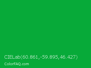 CIELab 60.861,-59.895,46.427 Color is a normal green color and the nearest color is Green Pantone #00ad43. Hex code #07aa39 and RGB value is rgb(7,170,57). In RGB color space, this color is composed of 3% red, 67% green, 22% blue, In CMYK color space, this color is composed of 96% cyan, 0% magenta, 66% yellow , 33% black , In HSL color space, this color has a hue angle of 138° , 92% saturation and 35% lightness.