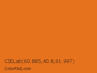 CIELab 60.885,40.8,61.997 Color is a normal orange color and the nearest color is Tango #ed7a1c. Hex code #e7721e and RGB value is rgb(231,114,30). In RGB color space, this color is composed of 91% red, 45% green, 12% blue, In CMYK color space, this color is composed of 0% cyan, 51% magenta, 87% yellow , 9% black , In HSL color space, this color has a hue angle of 25° , 81% saturation and 51% lightness.