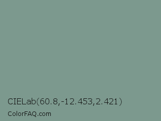 CIELab 60.8,-12.453,2.421 Color is a normal green color and the nearest color is Spanish Green #819885. Hex code #7c998e and RGB value is rgb(124,153,142). In RGB color space, this color is composed of 49% red, 60% green, 56% blue, In CMYK color space, this color is composed of 19% cyan, 0% magenta, 7% yellow , 40% black , In HSL color space, this color has a hue angle of 157° , 12% saturation and 54% lightness.