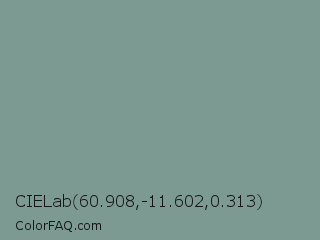 CIELab 60.908,-11.602,0.313 Color is a normal cyan color and the nearest color is Oxley #779e86. Hex code #7c9992 and RGB value is rgb(124,153,146). In RGB color space, this color is composed of 49% red, 60% green, 57% blue, In CMYK color space, this color is composed of 19% cyan, 0% magenta, 5% yellow , 40% black , In HSL color space, this color has a hue angle of 166° , 12% saturation and 54% lightness.