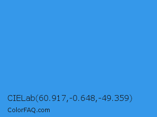 CIELab 60.917,-0.648,-49.359 Color is a normal blue color and the nearest color is Bleu De France #318ce7. Hex code #3598ea and RGB value is rgb(53,152,234). In RGB color space, this color is composed of 21% red, 60% green, 92% blue, In CMYK color space, this color is composed of 77% cyan, 35% magenta, 0% yellow , 8% black , In HSL color space, this color has a hue angle of 207° , 81% saturation and 56% lightness.