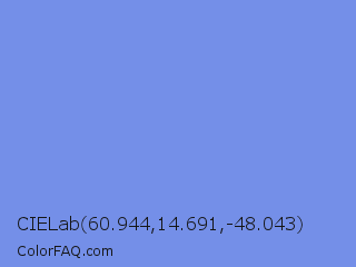 CIELab 60.944,14.691,-48.043 Color is a light blue color and the nearest color is Cornflower Blue #6495ed. Hex code #748fe8 and RGB value is rgb(116,143,232). In RGB color space, this color is composed of 45% red, 56% green, 91% blue, In CMYK color space, this color is composed of 50% cyan, 38% magenta, 0% yellow , 9% black , In HSL color space, this color has a hue angle of 226° , 72% saturation and 68% lightness.
