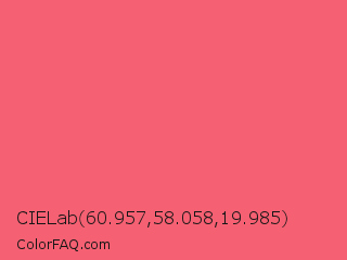 CIELab 60.957,58.058,19.985 Color is a light red color and the nearest color is Wild Watermelon #fd5b78. Hex code #f56173 and RGB value is rgb(245,97,115). In RGB color space, this color is composed of 96% red, 38% green, 45% blue, In CMYK color space, this color is composed of 0% cyan, 60% magenta, 53% yellow , 4% black , In HSL color space, this color has a hue angle of 353° , 88% saturation and 67% lightness.