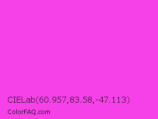 CIELab 60.957,83.58,-47.113 Color is a light magenta color and the nearest color is Purple Pizzazz #fe4eda. Hex code #f641e8 and RGB value is rgb(246,65,232). In RGB color space, this color is composed of 96% red, 25% green, 91% blue, In CMYK color space, this color is composed of 0% cyan, 74% magenta, 6% yellow , 4% black , In HSL color space, this color has a hue angle of 305° , 91% saturation and 61% lightness.