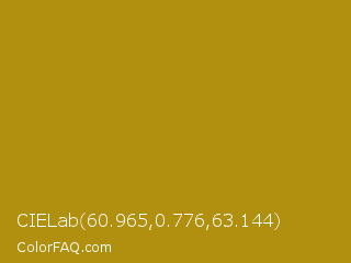 CIELab 60.965,0.776,63.144 Color is a normal yellow color and the nearest color is Dark Goldenrod #b8860b. Hex code #b0900e and RGB value is rgb(176,144,14). In RGB color space, this color is composed of 69% red, 56% green, 5% blue, In CMYK color space, this color is composed of 0% cyan, 18% magenta, 92% yellow , 31% black , In HSL color space, this color has a hue angle of 48° , 85% saturation and 37% lightness.