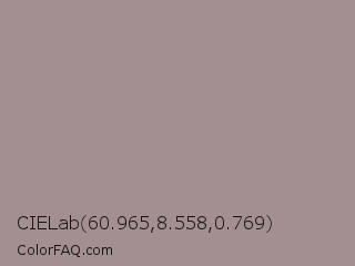 CIELab 60.965,8.558,0.769 Color is a normal red color and the nearest color is Zorba #a59b91. Hex code #a38e92 and RGB value is rgb(163,142,146). In RGB color space, this color is composed of 64% red, 56% green, 57% blue, In CMYK color space, this color is composed of 0% cyan, 13% magenta, 10% yellow , 36% black , In HSL color space, this color has a hue angle of 349° , 10% saturation and 60% lightness.