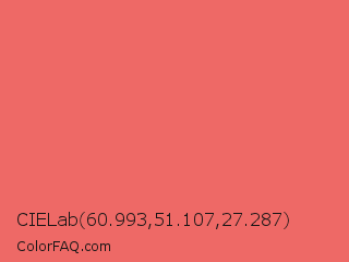 CIELab 60.993,51.107,27.287 Color is a light red color and the nearest color is Sunglo #e16865. Hex code #ee6966 and RGB value is rgb(238,105,102). In RGB color space, this color is composed of 93% red, 41% green, 40% blue, In CMYK color space, this color is composed of 0% cyan, 56% magenta, 57% yellow , 7% black , In HSL color space, this color has a hue angle of 1° , 80% saturation and 67% lightness.