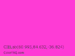 CIELab 60.995,84.632,-36.824 Color is a light magenta color and the nearest color is Razzle Dazzle Rose #ff33cc. Hex code #ff3bd6 and RGB value is rgb(255,59,214). In RGB color space, this color is composed of 100% red, 23% green, 84% blue, In CMYK color space, this color is composed of 0% cyan, 77% magenta, 16% yellow , 0% black , In HSL color space, this color has a hue angle of 313° , 100% saturation and 62% lightness.