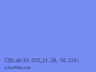 CIELab 61.005,21.28,-56.226 Color is a light blue color and the nearest color is Cornflower Blue #6495ed. Hex code #758cf7 and RGB value is rgb(117,140,247). In RGB color space, this color is composed of 46% red, 55% green, 97% blue, In CMYK color space, this color is composed of 53% cyan, 43% magenta, 0% yellow , 3% black , In HSL color space, this color has a hue angle of 229° , 89% saturation and 71% lightness.