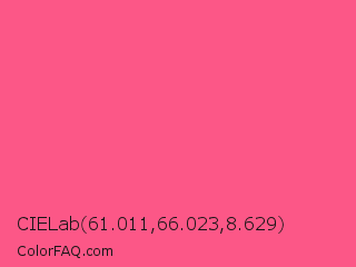 CIELab 61.011,66.023,8.629 Color is a light rose color and the nearest color is Strawberry #fc5a8d. Hex code #fc5787 and RGB value is rgb(252,87,135). In RGB color space, this color is composed of 99% red, 34% green, 53% blue, In CMYK color space, this color is composed of 0% cyan, 65% magenta, 46% yellow , 1% black , In HSL color space, this color has a hue angle of 343° , 96% saturation and 66% lightness.