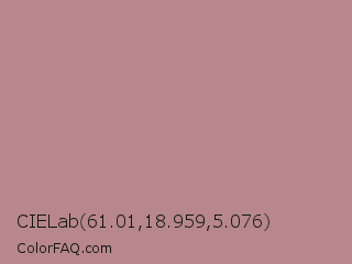 CIELab 61.01,18.959,5.076 Color is a light red color and the nearest color is Brandy Rose #bb8983. Hex code #b7878b and RGB value is rgb(183,135,139). In RGB color space, this color is composed of 72% red, 53% green, 55% blue, In CMYK color space, this color is composed of 0% cyan, 26% magenta, 24% yellow , 28% black , In HSL color space, this color has a hue angle of 355° , 25% saturation and 62% lightness.
