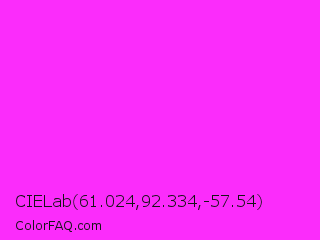 CIELab 61.024,92.334,-57.54 Color is a normal magenta color and the nearest color is Magenta / Fuchsia #ff00ff. Hex code #fb2cfb and RGB value is rgb(251,44,251). In RGB color space, this color is composed of 98% red, 17% green, 98% blue, In CMYK color space, this color is composed of 0% cyan, 82% magenta, 0% yellow , 2% black , In HSL color space, this color has a hue angle of 300° , 96% saturation and 58% lightness.