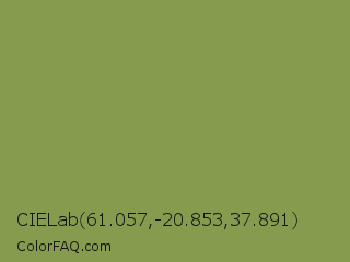 CIELab 61.057,-20.853,37.891 Color is a normal lime color and the nearest color is Moss Green #8a9a5b. Hex code #859c4e and RGB value is rgb(133,156,78). In RGB color space, this color is composed of 52% red, 61% green, 31% blue, In CMYK color space, this color is composed of 15% cyan, 0% magenta, 50% yellow , 39% black , In HSL color space, this color has a hue angle of 78° , 33% saturation and 46% lightness.