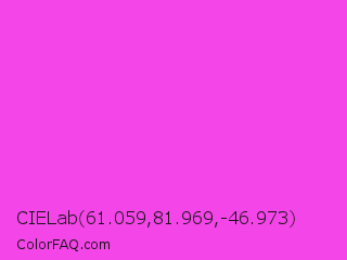 CIELab 61.059,81.969,-46.973 Color is a light magenta color and the nearest color is Purple Pizzazz #fe4eda. Hex code #f445e8 and RGB value is rgb(244,69,232). In RGB color space, this color is composed of 96% red, 27% green, 91% blue, In CMYK color space, this color is composed of 0% cyan, 72% magenta, 5% yellow , 4% black , In HSL color space, this color has a hue angle of 304° , 89% saturation and 61% lightness.