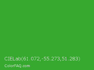 CIELab 61.072,-55.273,51.283 Color is a normal green color and the nearest color is Wageningen Green #34b233. Hex code #35a92e and RGB value is rgb(53,169,46). In RGB color space, this color is composed of 21% red, 66% green, 18% blue, In CMYK color space, this color is composed of 69% cyan, 0% magenta, 73% yellow , 34% black , In HSL color space, this color has a hue angle of 117° , 57% saturation and 42% lightness.