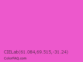 CIELab 61.084,69.515,-31.24 Color is a light magenta color and the nearest color is Light Deep Pink #ff5ccd. Hex code #ed58cc and RGB value is rgb(237,88,204). In RGB color space, this color is composed of 93% red, 35% green, 80% blue, In CMYK color space, this color is composed of 0% cyan, 63% magenta, 14% yellow , 7% black , In HSL color space, this color has a hue angle of 313° , 81% saturation and 64% lightness.