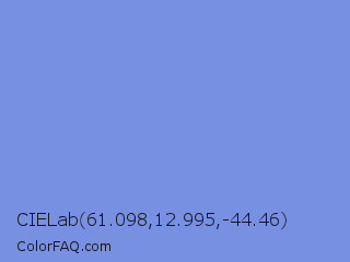 CIELab 61.098,12.995,-44.46 Color is a light blue color and the nearest color is Vista Blue #7c9ed9. Hex code #7790e2 and RGB value is rgb(119,144,226). In RGB color space, this color is composed of 47% red, 56% green, 89% blue, In CMYK color space, this color is composed of 47% cyan, 36% magenta, 0% yellow , 11% black , In HSL color space, this color has a hue angle of 226° , 65% saturation and 68% lightness.