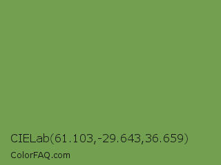 CIELab 61.103,-29.643,36.659 Color is a normal green color and the nearest color is Asparagus Green #7ba05b. Hex code #73a050 and RGB value is rgb(115,160,80). In RGB color space, this color is composed of 45% red, 63% green, 31% blue, In CMYK color space, this color is composed of 28% cyan, 0% magenta, 50% yellow , 37% black , In HSL color space, this color has a hue angle of 94° , 33% saturation and 47% lightness.