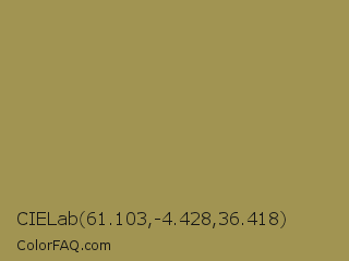 CIELab 61.103,-4.428,36.418 Color is a normal yellow color and the nearest color is Barley Corn #a68b5b. Hex code #a19452 and RGB value is rgb(161,148,82). In RGB color space, this color is composed of 63% red, 58% green, 32% blue, In CMYK color space, this color is composed of 0% cyan, 8% magenta, 49% yellow , 37% black , In HSL color space, this color has a hue angle of 50° , 33% saturation and 48% lightness.