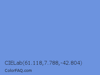 CIELab 61.118,7.788,-42.804 Color is a light blue color and the nearest color is Little Boy Blue #6ca0dc. Hex code #6c93df and RGB value is rgb(108,147,223). In RGB color space, this color is composed of 42% red, 58% green, 87% blue, In CMYK color space, this color is composed of 52% cyan, 34% magenta, 0% yellow , 13% black , In HSL color space, this color has a hue angle of 220° , 64% saturation and 65% lightness.