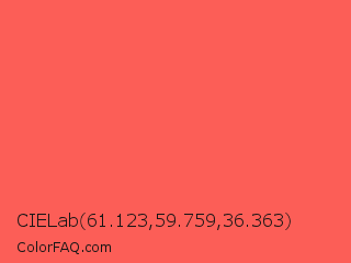 CIELab 61.123,59.759,36.363 Color is a light red color and the nearest color is Sunset Orange #fd5e53. Hex code #fc5e57 and RGB value is rgb(252,94,87). In RGB color space, this color is composed of 99% red, 37% green, 34% blue, In CMYK color space, this color is composed of 0% cyan, 63% magenta, 65% yellow , 1% black , In HSL color space, this color has a hue angle of 3° , 96% saturation and 66% lightness.