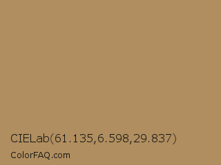 CIELab 61.135,6.598,29.837 Color is a normal orange color and the nearest color is Teak #b19461. Hex code #b08e5f and RGB value is rgb(176,142,95). In RGB color space, this color is composed of 69% red, 56% green, 37% blue, In CMYK color space, this color is composed of 0% cyan, 19% magenta, 46% yellow , 31% black , In HSL color space, this color has a hue angle of 35° , 34% saturation and 53% lightness.