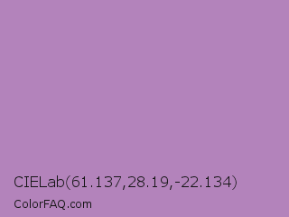 CIELab 61.137,28.19,-22.134 Color is a light purple color and the nearest color is African Violet #b284be. Hex code #b383bb and RGB value is rgb(179,131,187). In RGB color space, this color is composed of 70% red, 51% green, 73% blue, In CMYK color space, this color is composed of 4% cyan, 30% magenta, 0% yellow , 27% black , In HSL color space, this color has a hue angle of 291° , 29% saturation and 62% lightness.