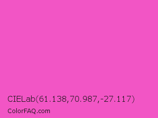 CIELab 61.138,70.987,-27.117 Color is a light magenta color and the nearest color is Light Deep Pink #ff5ccd. Hex code #f255c5 and RGB value is rgb(242,85,197). In RGB color space, this color is composed of 95% red, 33% green, 77% blue, In CMYK color space, this color is composed of 0% cyan, 65% magenta, 19% yellow , 5% black , In HSL color space, this color has a hue angle of 317° , 86% saturation and 64% lightness.