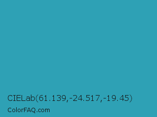 CIELab 61.139,-24.517,-19.45 Color is a normal cyan color and the nearest color is Eastern Blue #1e9ab0. Hex code #2ea1b5 and RGB value is rgb(46,161,181). In RGB color space, this color is composed of 18% red, 63% green, 71% blue, In CMYK color space, this color is composed of 75% cyan, 11% magenta, 0% yellow , 29% black , In HSL color space, this color has a hue angle of 189° , 59% saturation and 45% lightness.