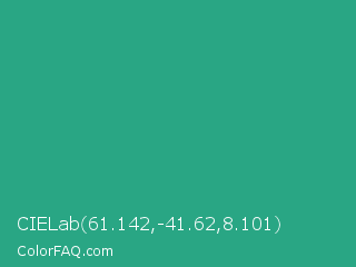 CIELab 61.142,-41.62,8.101 Color is a normal cyan color and the nearest color is Jungle Green #29ab87. Hex code #29a684 and RGB value is rgb(41,166,132). In RGB color space, this color is composed of 16% red, 65% green, 52% blue, In CMYK color space, this color is composed of 75% cyan, 0% magenta, 20% yellow , 35% black , In HSL color space, this color has a hue angle of 164° , 60% saturation and 41% lightness.