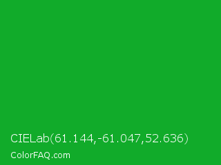 CIELab 61.144,-61.047,52.636 Color is a normal green color and the nearest color is Green Pantone #00ad43. Hex code #11ab2a and RGB value is rgb(17,171,42). In RGB color space, this color is composed of 7% red, 67% green, 16% blue, In CMYK color space, this color is composed of 90% cyan, 0% magenta, 75% yellow , 33% black , In HSL color space, this color has a hue angle of 130° , 82% saturation and 37% lightness.