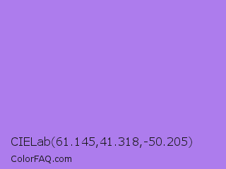 CIELab 61.145,41.318,-50.205 Color is a light violet color and the nearest color is Lavender #b57edc. Hex code #ad7ced and RGB value is rgb(173,124,237). In RGB color space, this color is composed of 68% red, 49% green, 93% blue, In CMYK color space, this color is composed of 27% cyan, 48% magenta, 0% yellow , 7% black , In HSL color space, this color has a hue angle of 266° , 76% saturation and 71% lightness.