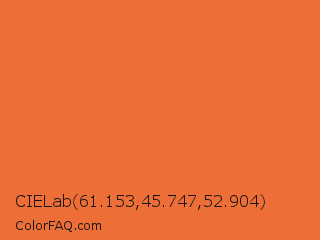 CIELab 61.153,45.747,52.904 Color is a normal orange color and the nearest color is Deep Carrot Orange #e9692c. Hex code #ed6e36 and RGB value is rgb(237,110,54). In RGB color space, this color is composed of 93% red, 43% green, 21% blue, In CMYK color space, this color is composed of 0% cyan, 54% magenta, 77% yellow , 7% black , In HSL color space, this color has a hue angle of 18° , 84% saturation and 57% lightness.