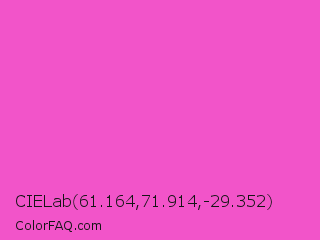 CIELab 61.164,71.914,-29.352 Color is a light magenta color and the nearest color is Light Deep Pink #ff5ccd. Hex code #f254c9 and RGB value is rgb(242,84,201). In RGB color space, this color is composed of 95% red, 33% green, 79% blue, In CMYK color space, this color is composed of 0% cyan, 65% magenta, 17% yellow , 5% black , In HSL color space, this color has a hue angle of 316° , 86% saturation and 64% lightness.