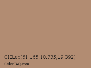 CIELab 61.165,10.735,19.392 Color is a normal orange color and the nearest color is Light Taupe #b38b6d. Hex code #b28c72 and RGB value is rgb(178,140,114). In RGB color space, this color is composed of 70% red, 55% green, 45% blue, In CMYK color space, this color is composed of 0% cyan, 21% magenta, 36% yellow , 30% black , In HSL color space, this color has a hue angle of 24° , 29% saturation and 57% lightness.