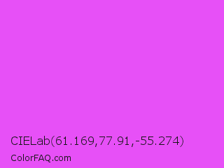 CIELab 61.169,77.91,-55.274 Color is a light magenta color and the nearest color is Pink Flamingo Crayola #ff66ff. Hex code #e750f7 and RGB value is rgb(231,80,247). In RGB color space, this color is composed of 91% red, 31% green, 97% blue, In CMYK color space, this color is composed of 6% cyan, 68% magenta, 0% yellow , 3% black , In HSL color space, this color has a hue angle of 294° , 91% saturation and 64% lightness.