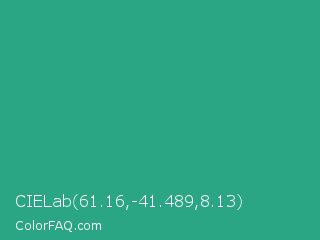 CIELab 61.16,-41.489,8.13 Color is a normal cyan color and the nearest color is Jungle Green #29ab87. Hex code #2aa684 and RGB value is rgb(42,166,132). In RGB color space, this color is composed of 16% red, 65% green, 52% blue, In CMYK color space, this color is composed of 75% cyan, 0% magenta, 20% yellow , 35% black , In HSL color space, this color has a hue angle of 164° , 60% saturation and 41% lightness.