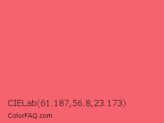 CIELab 61.187,56.8,23.173 Color is a light red color and the nearest color is Wild Watermelon #fd5b78. Hex code #f5636e and RGB value is rgb(245,99,110). In RGB color space, this color is composed of 96% red, 39% green, 43% blue, In CMYK color space, this color is composed of 0% cyan, 60% magenta, 55% yellow , 4% black , In HSL color space, this color has a hue angle of 355° , 88% saturation and 67% lightness.