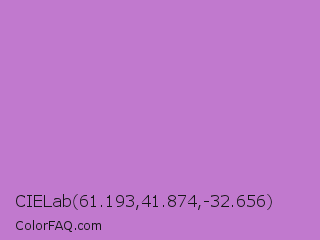 CIELab 61.193,41.874,-32.656 Color is a light purple color and the nearest color is Lavender #b57edc. Hex code #c179ce and RGB value is rgb(193,121,206). In RGB color space, this color is composed of 76% red, 47% green, 81% blue, In CMYK color space, this color is composed of 6% cyan, 41% magenta, 0% yellow , 19% black , In HSL color space, this color has a hue angle of 291° , 46% saturation and 64% lightness.